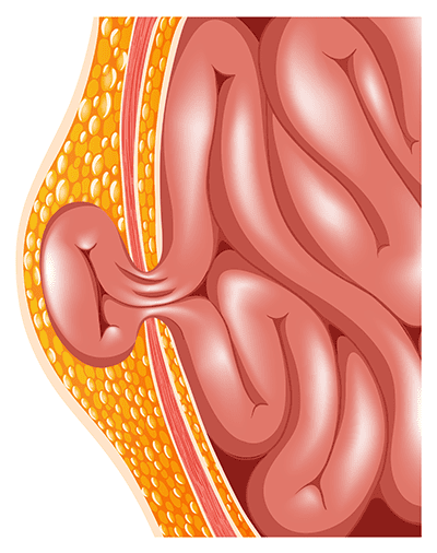 The intestines are held in place by complex layers of fat, tissue and muscle. A hernia occurs when the layer of muscle weakens and tears, allowing the intestine to protrude through those layers. These can result in a very painful bump visible on the surface of the skin, and can even be life-threatening in some situations.